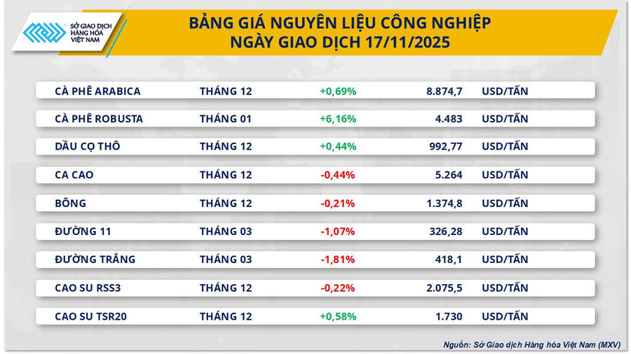 Khép lại phiên giao dịch ngày hôm qua, thị trường nguyên liệu công nghiệp ghi nhận những diễn biến trái chiều. Nổi bật trong đó là giá cà phê Robusta khi tăng tới hơn 6% lên mức 4.483 USD/tấn trong khi giá cà phê Arabica cũng tăng nhẹ gần 0,7%, đạt mức 6.674 USD/tấn.