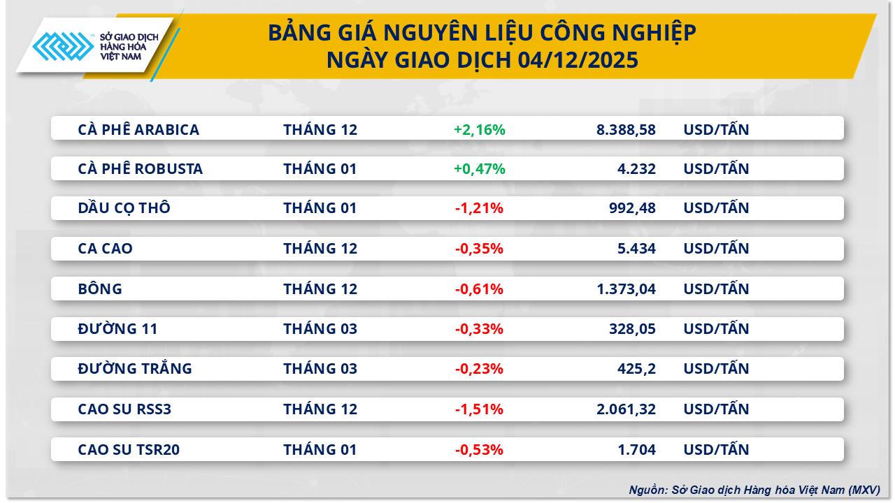 Sắc xanh tiếp tục duy trì trên thị trường hàng hóa nguyên liệu thế giới trong phiên giao dịch ngày 4/12. Tâm điểm của thị trường đổ dồn về hai mặt hàng cà phê và dầu thô khi giá những mặt hàng này đồng loạt tăng mạnh. Đóng cửa, chỉ số MXV-Index tăng gần 0,2% lên mức 2.382 điểm.