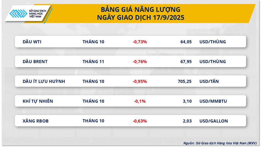 Không nằm ngoài xu hướng chung của toàn thị trường, nhóm năng lượng trong phiên hôm qua cũng ghi nhận lực bán áp đảo khi toàn bộ 5 mặt hàng trong nhóm đồng loạt chìm trong sắc đỏ. Trong đó, giá dầu Brent đã quay đầu về mốc 67,95 USD/thùng, tương ứng với mức giảm khoảng 0,76%; tương tự là giá dầu WTI với mức giảm khoảng 0,73%, rơi xuống mốc 64,05 USD/thùng.