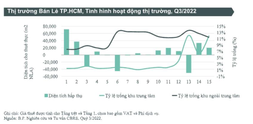 Thị trường mặt bằng bán lẻ tại các trung tâm thương mại đang chứng kiến sự hoạt động trở lại với số liệu tích cực. Báo cáo thống kê thị trường quý III/2022 của CBRE Việt Nam mới đây cho thấy, tại TP HCM, tỷ lệ trống được cải thiện ở cả khu vực trung tâm và ngoài trung tâm so với quý trước.