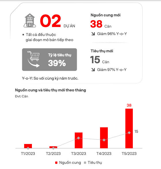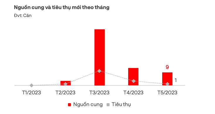 Sức cầu thị trường mặc dù tăng nhưng không đáng kể, lượng tiêu thụ còn hạn chế, bằng 3% so với cùng kỳ năm 2022. Tuy nhiên, so với các tháng trước đó, mức tiêu thụ trong tháng 5 đã có dấu hiệu khởi sắc khi bán được 15 căn.