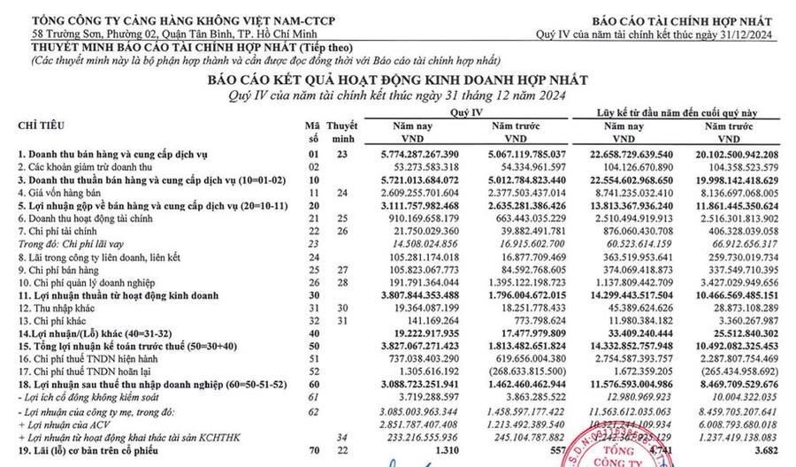 Tính chung cả năm 2024, ACV ghi nhận doanh thu thuần đạt 22.554 tỷ đồng, lợi nhuận sau thuế đạt 11.576 tỷ đồng, tăng lần lượt 13% và 37% so với năm 2023.