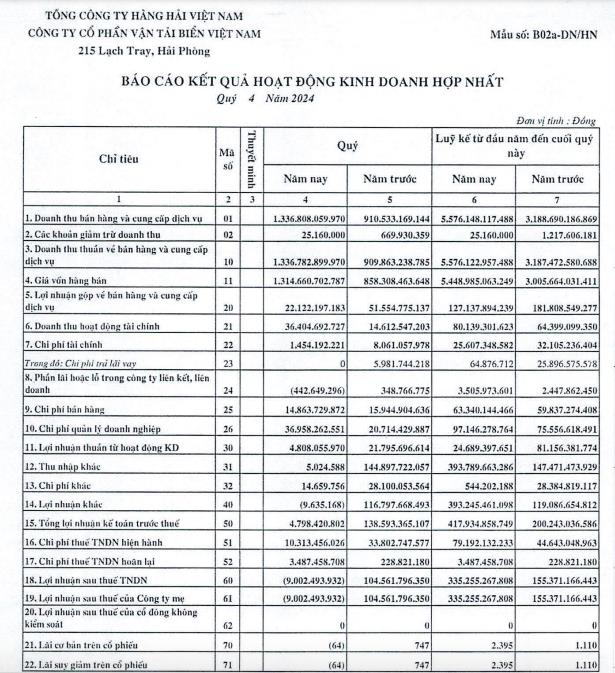 Công ty cổ phần Vận tải biển Việt Nam (Vosco, mã ck: VOS) vừa công bố báo cáo hợp nhất quý IV/2024 với tổng doanh thu đạt 1.336 tỷ đồng, tăng 46,9% so với cùng kỳ năm trước.