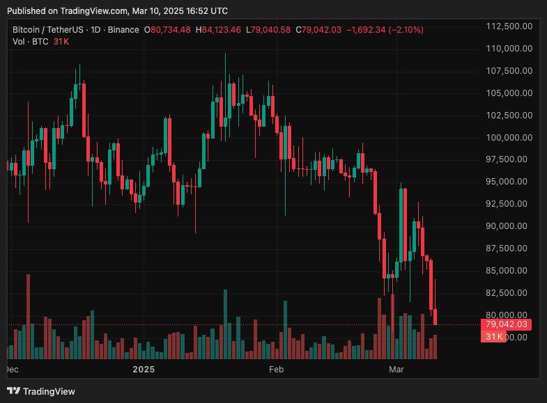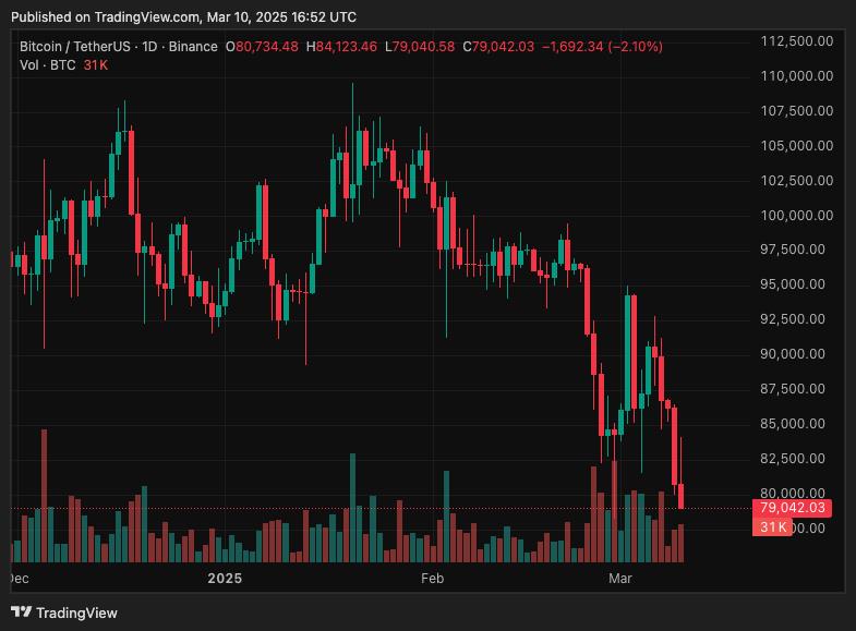 Không chỉ chứng khoán, tiền điện tử cũng rơi vào vòng xoáy bán tháo. Bitcoin giảm 5,78% trong vòng 24 giờ, hiện giao dịch ở 77.899 USD, mất 28% giá trị từ mức đỉnh 109.241 USD. Ethereum lao dốc 37%, chỉ còn 1.793 USD. Solana mất 46%, Cardano giảm 52%, trong khi XRP mất 44%.