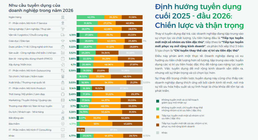 Mặc dù trọng tâm tuyển dụng dồn về công nghệ, các nhóm ngành kinh doanh cốt lõi vẫn duy trì sức nóng vốn có. Kinh doanh và Bán hàng vẫn là nhóm nghề được săn đón nhiều nhất với 47,5% doanh nghiệp có nhu cầu, tiếp theo là IT - Phần mềm và Marketing - Truyền thông. Tuy nhiên, yêu cầu đối với các vị trí này cũng đang thay đổi theo hướng đòi hỏi ứng viên phải biết ứng dụng công nghệ để gia tăng hiệu quả công việc, giảm thiểu các tác vụ thủ công lặp lại.
