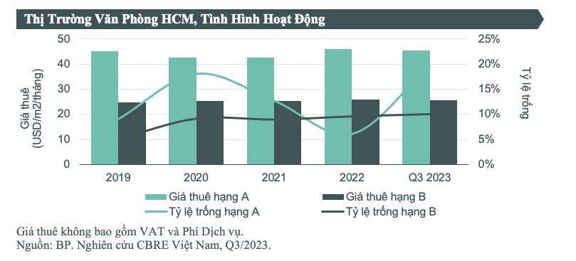 Cụ thể, tại TP. HCM, giá thuê văn phòng Hạng A là 45,5 USD/m2/tháng, tăng nhẹ 0,3% so với quý trước. Còn đối với hạng B, mức giá chào thuê trung bình là 25,6 USD/m2/tháng, tương đương với giá chào thuê quý II.