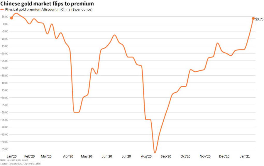 Giá vàng physical tuần này tại Trung Quốc – nước tiêu thụ vàng lớn nhất thế giới – đã có mức cộng nhỏ (so với giá tham chiếu toàn cầu) lần đầu tiên kể từ đầu năm 2020, do nhu cầu mạnh lên.