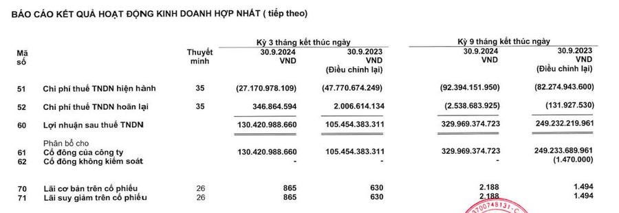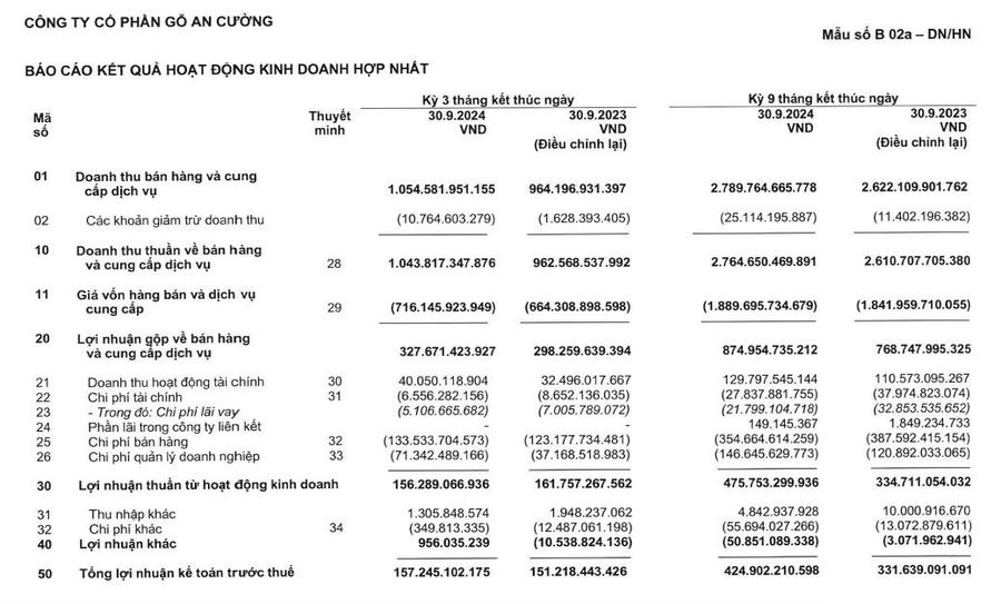 Khấu trừ giá vốn, chi phí, gỗ An Cường ghi nhận lợi nhuận thuần từ hoạt động kinh doanh đạt 156 tỷ đồng, giảm 3,4% so với quý III năm ngoái. Lợi nhuận sau thuế đạt 130,4 tỷ đồng, tăng 23,7% so với cùng kỳ năm 2023.