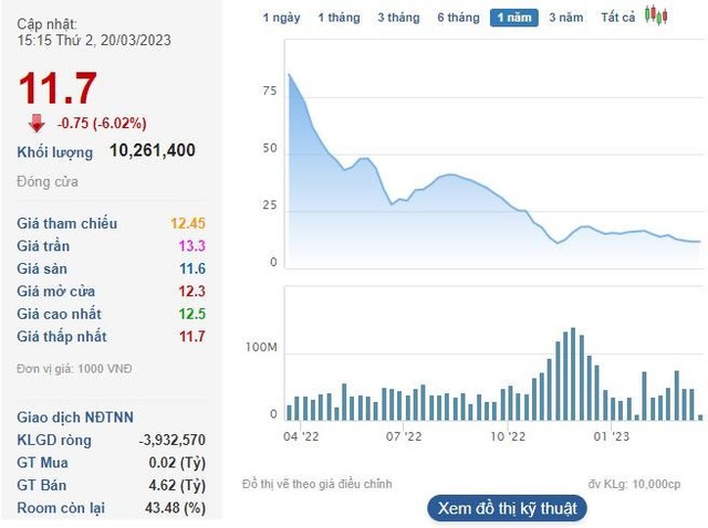 Trên thị trường, cổ phiếu DIG đang có xu hướng trôi dần về vùng đáy hồi giữa tháng 11 năm ngoái. Kết thúc phiên 20/3, thị giá DIG còn 11.700 đồng/cp, giảm 88% so với đỉnh cách đây hơn một năm. Vốn hóa tương ứng giảm xuống 7.100 tỷ đồng.