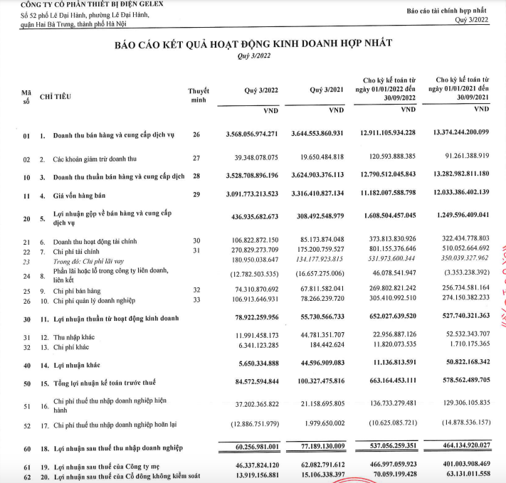 Về kết quả kinh doanh, quý III/2022, GEE ghi nhận doanh thu thuần đạt 3.528 tỷ đồng, giảm 2,64% so với cùng kỳ. Lợi nhuận sau thuế đạt 60,25 tỷ đồng, giảm 21,9% so với quý III/2021.