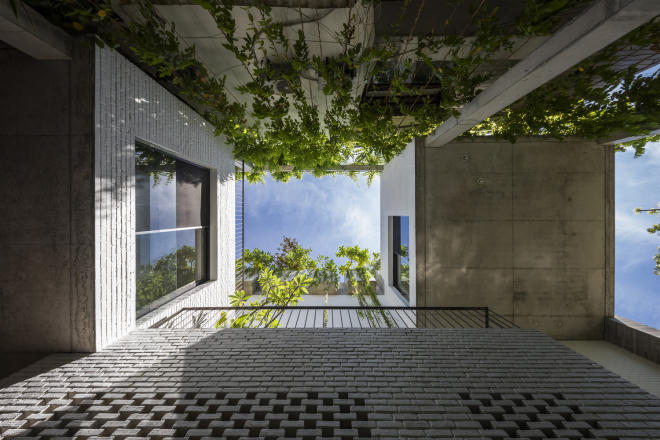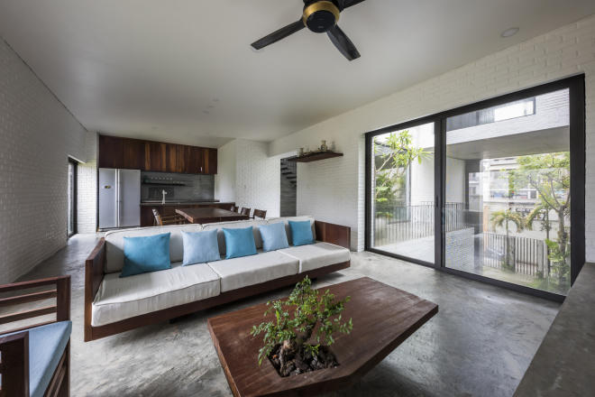 Các không gian lấy sáng tự nhiên được thêm vào giữa các khối phòng, với nội thất đơn giản và một màu.