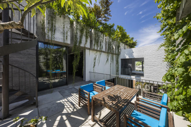 Không gian được chia thành 4 khối, với 1 lớn và 3 nhỏ, bao quanh bằng nhiều vườn cây và có kết cấu lấy sáng tự nhiên. Trên diện tích hạn chế khoảng 250m2, tòa nhà được thiết kế hai phần song song bao gồm khu vực cho khu vườn với bức tường phủ kín cây xanh và không gian sống có nhiều cửa sổ hướng về “rừng nhiệt đới”.