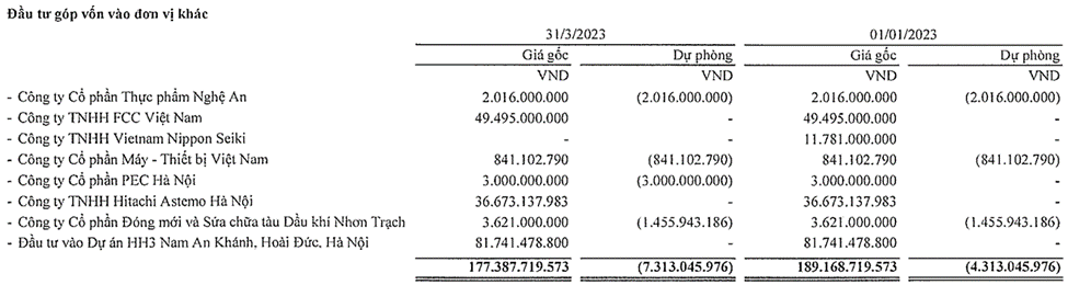 Ghi nhận trên báo cáo tài chính hợp nhất quý 1/2023, đến thời điểm 31/3, PVMachino đã thoái toàn bộ 10% vốn tại VNS nhưng vẫn còn nắm 10% vốn tại Công ty TNHH FCC Việt Nam với giá gốc gần 49,5 tỷ đồng.