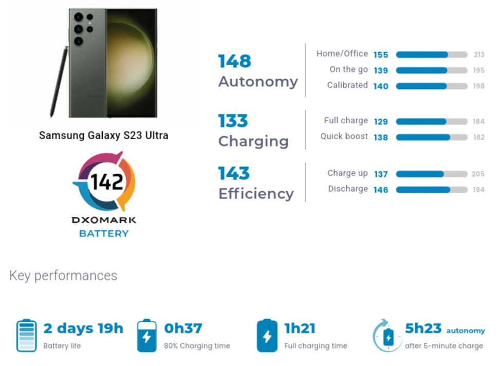 DxOMark cho biết Galaxy S23 Ultra có thể dùng 2 ngày 19 giờ trong một lần sạc. Về ưu nhược điểm, thời lượng pin của điện thoại đạt điểm ở mức sử dụng vừa phải, đạt gần 67 giờ sử dụng. Máy thể hiện tốt khi xem video nhưng sẽ kém hơn trong các hoạt động khác như camera hay nghe nhạc. Tuy nhiên, thời lượng pin bắt đầu giảm mạnh khi pin còn lại 5%. Đó là một vấn đề phổ biến với điện thoại Samsung. Rất có thể sau khi đã tối ưu thành công về pin cho S23 Ultra, Samsung sẽ có kinh nghiệm hơn dành cho những chiếc máy ra mắt sau này từ đó người dùng lại được hưởng lợi.