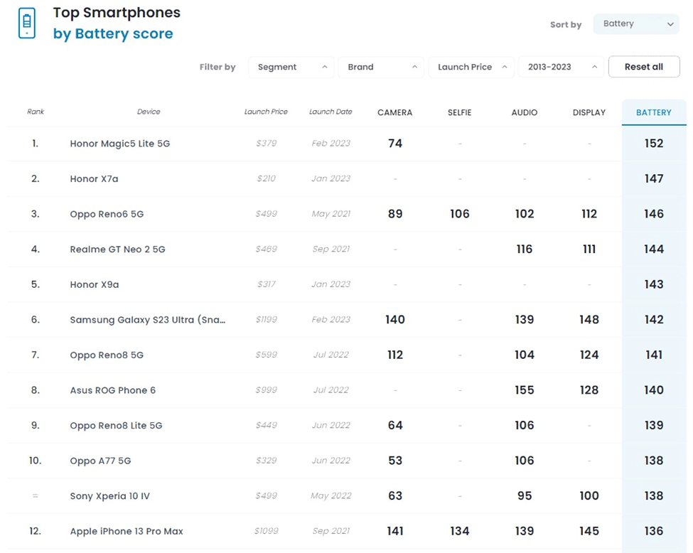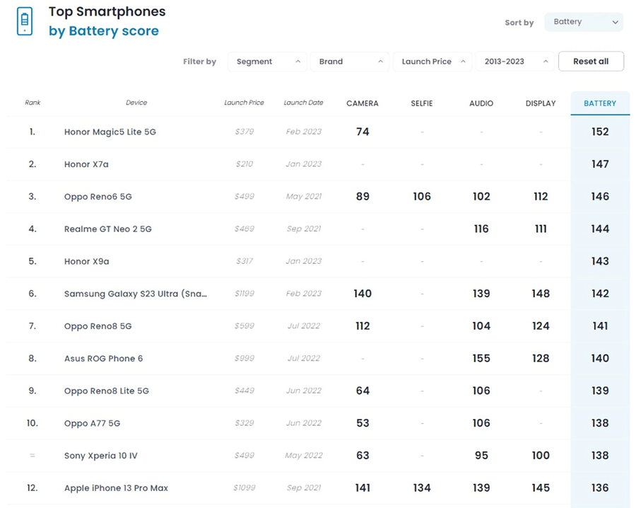 Trong bảng xếp hạng, Galaxy S23 Ultra xếp thứ 6 sau Honor Magic5 Lite 5G, Honor x7a, Oppo Reno6 6G, Realme GT Neo 2 5G và Honor x9a. Nhưng lưu ý rằng S23 Ultra là một flagship vì vậy hiệu năng chắc chắn mạnh hơn những cái tên kể trên và quan trọng là không có chiếc iPhone nào pin trâu hơn S23 Ultra cả.