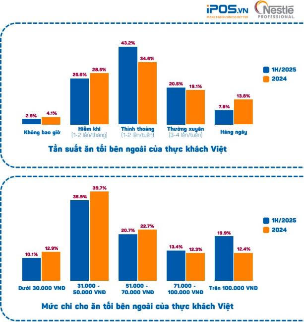 Báo cáo của iPOS.vn cũng chỉ ra, trong nửa đầu năm 2025, thói quen ăn tối bên ngoài của người Việt có nhiều thay đổi so với 2024.