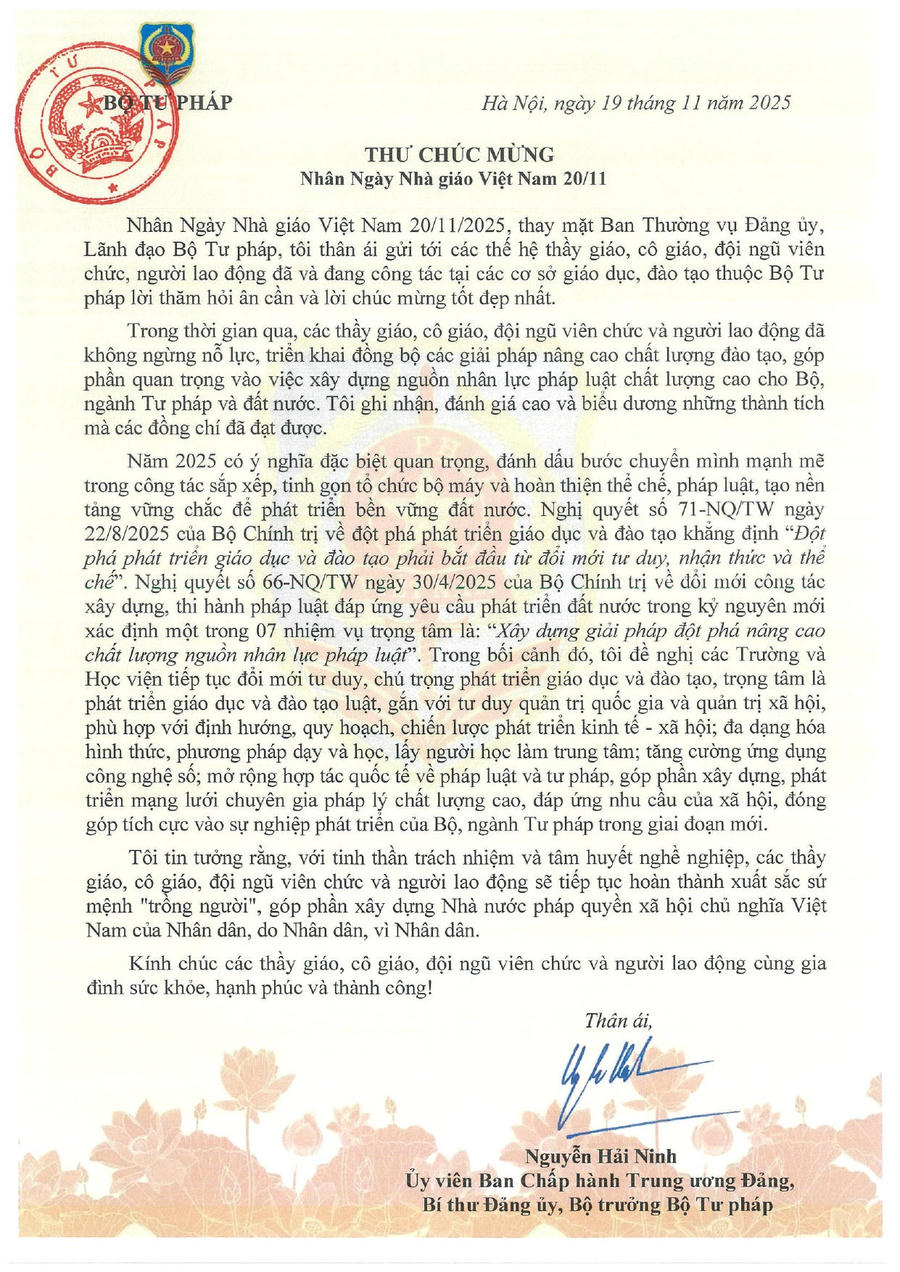 Ủy viên Ban Chấp hành Trung ương Đảng, Bí thư Đảng ủy, Bộ trưởng Bộ Tư pháp Nguyễn Hải Ninh vừa có Thư chúc mừng nhân Ngày Nhà giáo Việt Nam 20/11. Báo Pháp luật Việt Nam trân trọng giới thiệu Thư của Bộ trưởng.