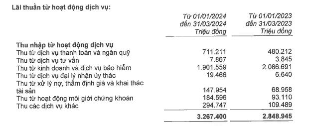 Trong đó, lãi thuần từ dịch vụ đạt hơn 945 tỷ đồng, tăng 37%, nhờ thu từ dịch vụ thanh toán và ngân quỹ tăng 48% lên mức 711 tỷ đồng, khoản thu từ dịch vụ xử lý nợ, thẩm định giá và khai thác tài sản gấp 2,6 lần lên mức 147 tỷ đồng.