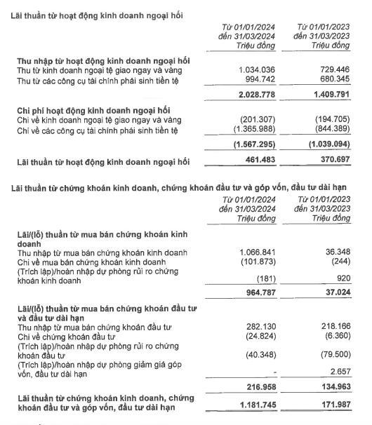 Lãi từ kinh doanh ngoại hối cũng tăng 24% lên mức 461,4 tỷ đồng. Cùng với đó, lãi thuần từ chứng khoán đầu tư tăng 60,8%, mang về cho MB 217 tỷ đồng trong quý I/2024.