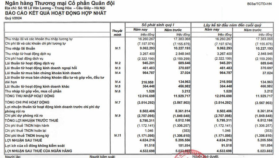 Theo báo cáo tài chính hợp nhất quý I/2024 của Ngân hàng TMCP Quân Đội (MB, mã ck: MBB), công ty ghi nhận lợi nhuận trước thuế đạt 5.795 tỷ đồng, giảm 11% so với cùng kỳ năm trước. Lãi sau thuế của MB là 4.624 tỷ đồng.
