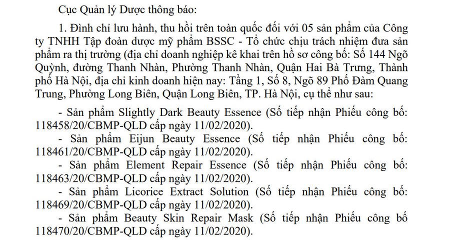 Cụ thể, 5 sản phẩm bị đình chỉ lưu hành gồm Slightly Dark Beauty Essence; Eijun Beauty Essence; Element Repair Essence; Licorice Extract Solution và Beauty Skin Repair Mask. Tất cả đều được cấp số tiếp nhận Phiếu công bố vào ngày 11/2/2020.
