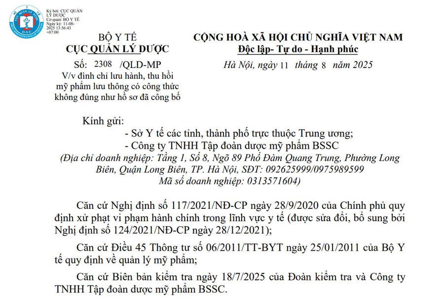 Về phía doanh nghiệp, Công ty TNHH Tập đoàn dược mỹ phẩm BSSC có trách nhiệm gửi thông báo thu hồi đến toàn bộ hệ thống phân phối, tiếp nhận sản phẩm trả lại và tiến hành thu hồi, tiêu hủy toàn bộ số hàng vi phạm. Báo cáo kết quả thu hồi phải được gửi về Cục Quản lý Dược trước ngày 30/8/2025.