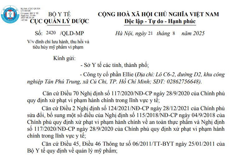 Bên cạnh đó, Sở Y tế TP.HCM được giao nhiệm vụ giám sát việc thu hồi, tiêu hủy của doanh nghiệp, đồng thời thu hồi số tiếp nhận Phiếu công bố sản phẩm mỹ phẩm 2083/22/CBMP-HCM. Đồng thời tiến hành kiểm tra, xử lý vi phạm theo quy định và báo cáo kết quả về Cục Quản lý Dược trước ngày 05/10/2025.