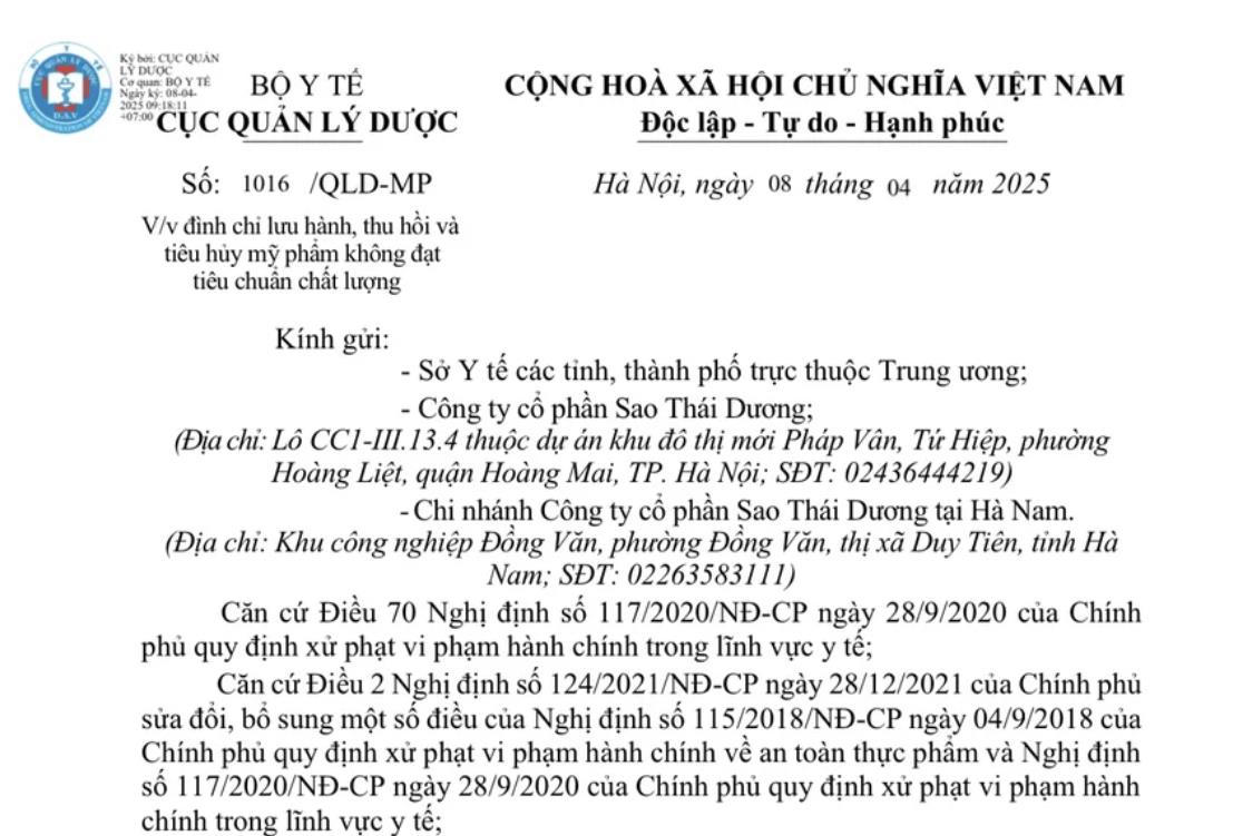 Cục Quản lý Dược (Bộ Y tế) vừa có Quyết định đình chỉ lưu hành và thu hồi toàn quốc một lô sản phẩm dầu gội trị chấy của CTCP Sao Thái Dương do vi phạm quy định về chất lượng mỹ phẩm.