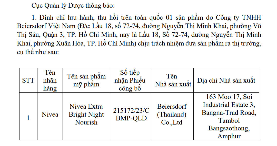 Cục Quản lý Dược (Bộ Y tế) vừa có thông báo đình chỉ lưu hành, thu hồi và tiêu hủy sản phẩm mỹ phẩm Nivea Extra Bright Night Nourish trên toàn quốc do Công ty TNHH Beiersdorf Việt Nam (Tầng 18, số 72-74, đường Nguyễn Thị Minh Khai, phường Xuân Hòa, TP HCM) chịu trách nhiệm phân phối.