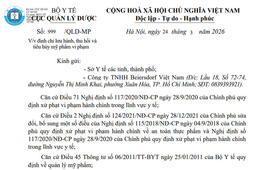 Về phía doanh nghiệp, Cục Quản lý Dược yêu cầu Công ty TNHH Beiersdorf Việt Nam gửi thông báo thu hồi tới các cơ sở phân phối, tiếp nhận sản phẩm trả lại và tiến hành tiêu hủy toàn bộ sản phẩm không đáp ứng quy định, gửi báo cáo kết quả thu hồi và tiêu hủy về Cục trước ngày 20/4/2026.