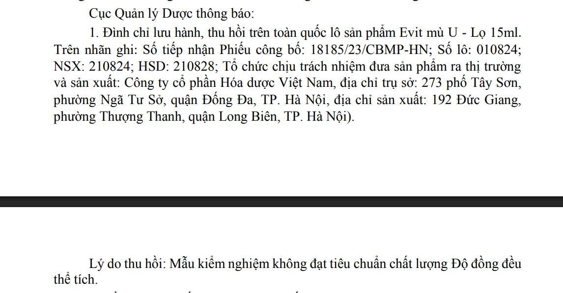 Về phía doanh nghiệp, CTCP Hóa dược Việt Nam có trách nhiệm gửi thông báo thu hồi tới tất cả các nơi phân phối, sử dụng lô sản phẩm Evit Mù U - lọ 15ml; tiếp nhận sản phẩm trả lại từ các cơ sở kinh doanh và tiến hành thu hồi toàn bộ lô sản phẩm không đạt chất lượng.