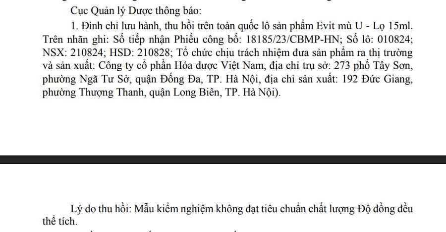 Lý do thu hồi là do mẫu thử của lô sản phẩm Evit Mù U - lọ 15ml không đạt yêu cầu về chỉ tiêu độ đồng đều thể tích.