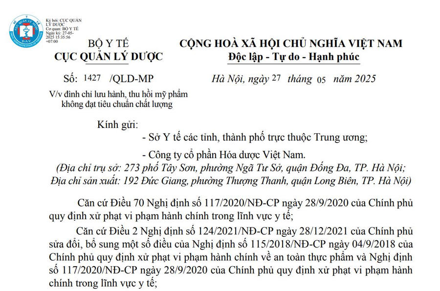 Riêng Sở Y tế TP Hà Nội được giao nhiệm vụ giám sát chặt chẽ việc thu hồi của công ty, đồng thời kiểm tra hoạt động tuân thủ pháp luật trong sản xuất, kinh doanh mỹ phẩm của CTCP Hóa dược Việt Nam. Trường hợp phát hiện vi phạm, cần xử lý, xử phạt nghiêm theo quy định.