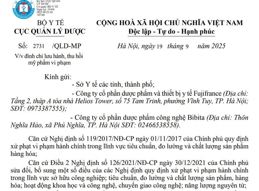 Bên cạnh đó, hai công ty liên quan là Fujifrance và Bibita phải có trách nhiệm gửi thông báo thu hồi đến các cơ sở phân phối, sử dụng; tiếp nhận sản phẩm bị trả lại; tiến hành thu hồi triệt để và tiêu hủy theo quy định tại khoản 54 Điều 2 Nghị định 126/2021/NĐ-CP nếu không thể loại bỏ yếu tố vi phạm. Báo cáo thu hồi phải được gửi về Cục Quản lý Dược trước ngày 17/10/2025.