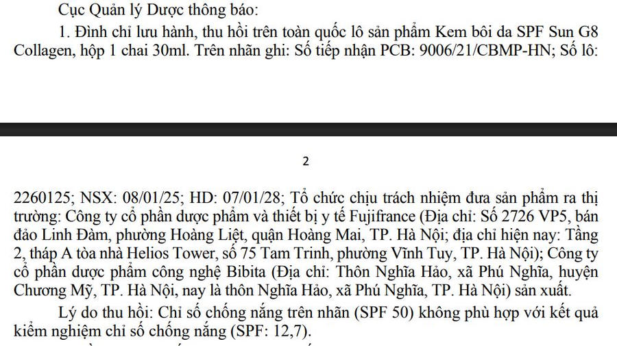 Lô sản phẩm bị thu hồi có số lô 2260125, ngày sản xuất 08/1/2025, hạn dùng 07/1/2028, trên nhãn ghi số tiếp nhận Phiếu công bố 9006/21/CBMP-HN. Sản phẩm do CTCP Dược phẩm và Thiết bị y tế Fujifrance (địa chỉ nay là: Tầng 2, tháp A, tòa nhà Helios Tower, số 75 Tam Trinh, phường Vĩnh Tuy, TP Hà Nội) chịu trách nhiệm đưa ra thị trường, và được sản xuất bởi CTCP Dược phẩm Công nghệ Bibita (địa chỉ nay là: thôn Nghĩa Hảo, xã Phú Nghĩa, TP Hà Nội).