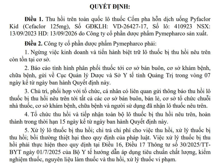Cục Quản lý Dược (Bộ Y tế) vừa có Quyết định thu hồi toàn quốc lô thuốc cốm pha hỗn dịch uống Pyfaclor Kid (Cefaclor 125mg) của CTCP Dược phẩm Pymepharco do vi phạm chất lượng mức độ 2.