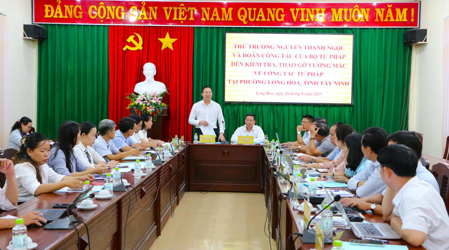 Thực hiện Công văn số 5135/BTP-HCTP ngày 20/8/2025 của Bộ Tư pháp về việc kiểm tra, hướng dẫn tháo gỡ khó khăn, vướng mắc trong thực hiện mô hình chính quyền hai cấp trong lĩnh vực hộ tịch, Thứ trưởng Bộ Tư pháp Nguyễn Thanh Ngọc và đoàn công tác Bộ Tư pháp đã có buổi làm việc với hai xã Châu Thành và phường Long Hoa, Tây Ninh, ngày 26/8/2025.