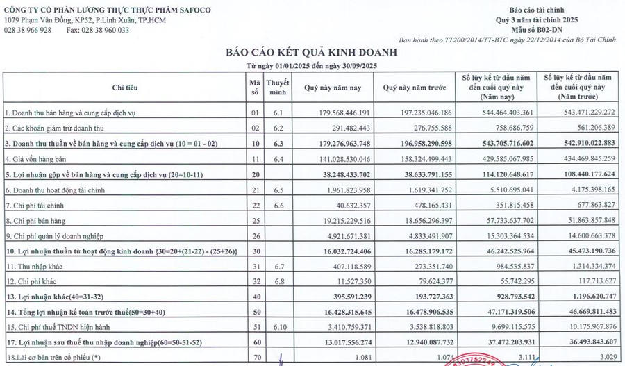 Công ty cổ phần Lương thực Thực phẩm Safoco (mã ck: SAF) vừa công bố báo cáo kinh doanh quý III/2025.