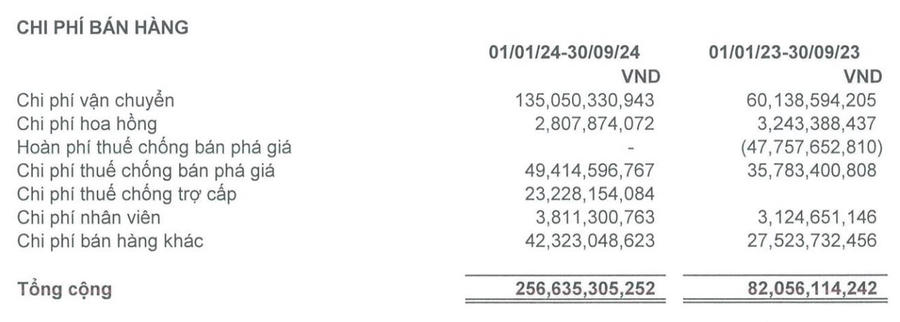 Thêm nữa, chi phí bán hàng tăng 160,08% do cước vận chuyển đang giai đoạn tăng cao, trích trước chi phí thuế chống bán phá giá (AD) và thuế chống trợ cấp (CVD) trên doanh thu bán hàng sang Mỹ để tránh rủi ro thị trường Mỹ đang giai đoạn xem xét hồ sơ.
