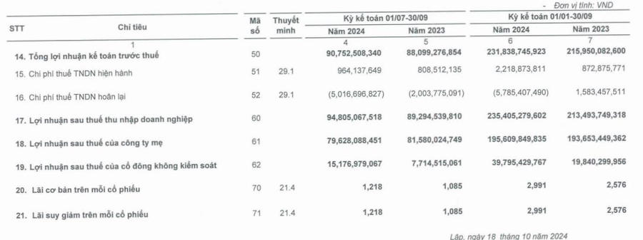 Lũy kế 9 tháng năm nay, công ty đạt doanh thu gần 5.548 tỷ đồng, tăng 44,7% so với cùng kỳ năm ngoái. Lãi sau thuế đạt gần 232 tỷ đồng, tăng 10% so với 9 tháng đầu năm ngoái.