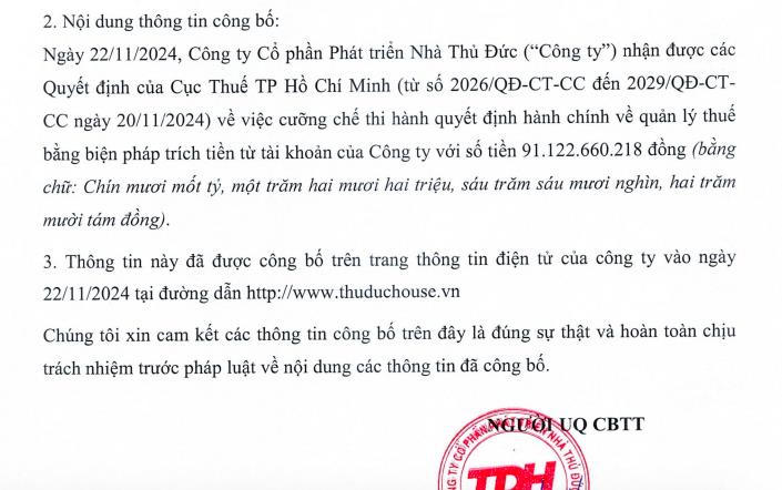 Trước đó, vào tháng 9 và 10/2024, Thuduc House cũng nhận được các quyết định cưỡng chế của Cục thuế TPHCM bằng hình thức trích tiền từ tài khoản của công ty, với số tiền lần lượt là 91,16 và 91,15 tỷ đồng.