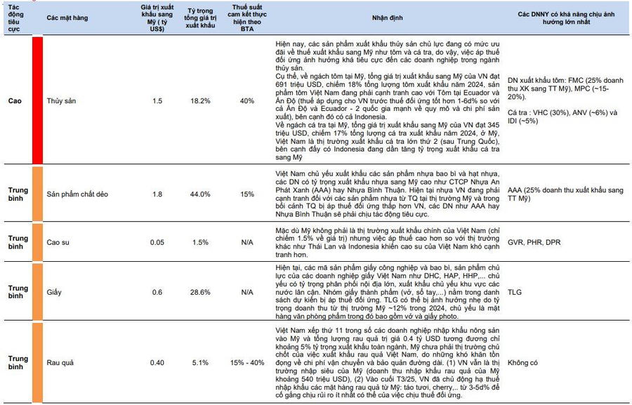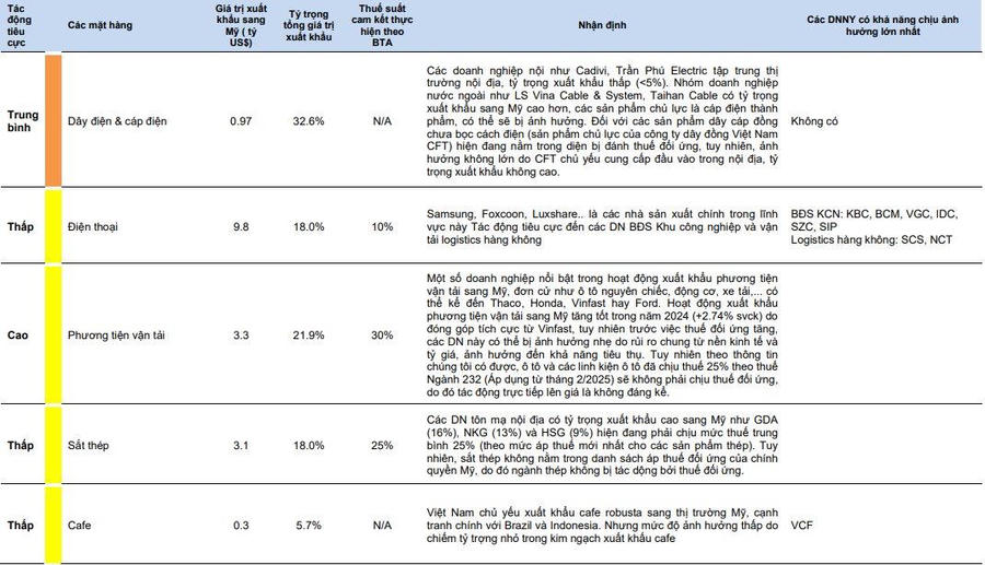 Khi đi sâu phân tích tác động lên 15 mặt hàng xuất khẩu chủ lực, MBS nhận định mức độ ảnh hưởng sẽ có sự phân hóa giữa các ngành, phụ thuộc vào các yếu tố như tỷ trọng xuất khẩu sang Mỹ trong tổng kim ngạch xuất khẩu của ngành, vị thế cạnh tranh so với các quốc gia khác trong cùng phân khúc, và các cam kết thuế quan hiện hành (như trong Hiệp định Thương mại Việt Nam – Hoa Kỳ có hiệu lực từ tháng 12/2001).