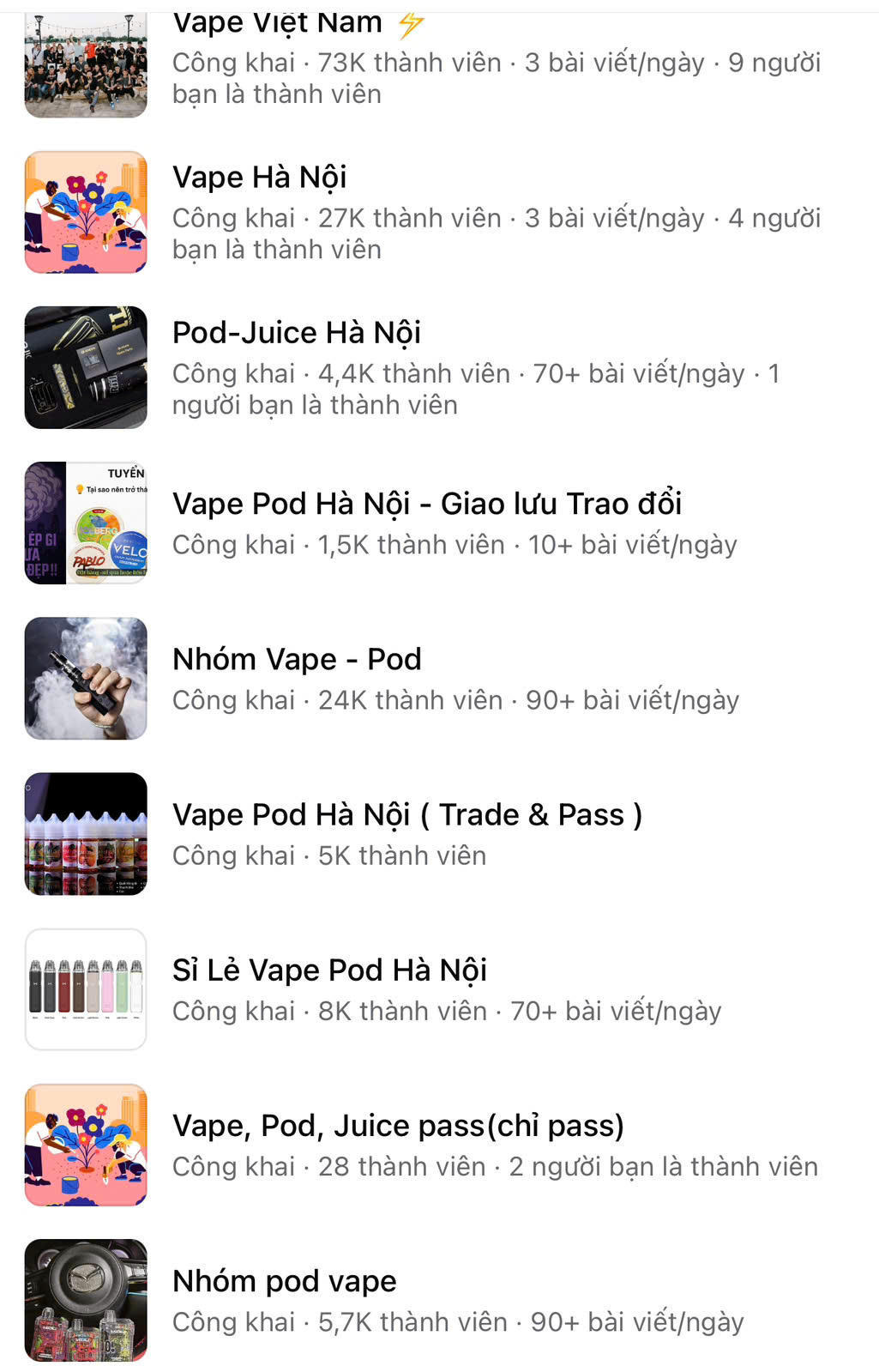 Chỉ cần gõ từ khóa “vape”, “pod”, “thuốc lá điện tử” hoặc các ký hiệu ẩn như “tlđt” là hàng loạt các bài đăng rao bán đồng loạt hiện ra. Có những trang fanpage, hội nhóm trên Facebook với hàng chục nghìn thành viên ngang nhiên trao đổi, mua bán các loại pod, vape, tinh dầu…