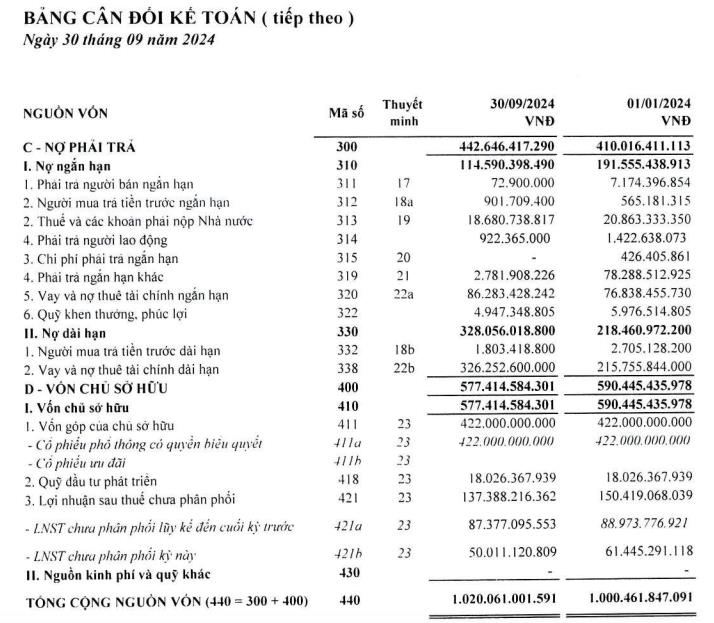 Vốn chủ sở hữu tính đến 30/9/2024 là 577,4 tỷ đồng, giảm so với con số 590,4 tỷ đồng hồi đầu năm. Lợi nhuận sau thuế chưa phân phối là 137,3 tỷ đồng.