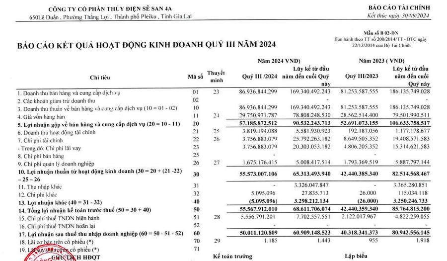 Công ty cổ phần Thủy điện Sê San 4A (mã ck: S4A) vừa công bố kết quả kinh doanh quý III/2024 với nhiều điểm đáng chú ý.