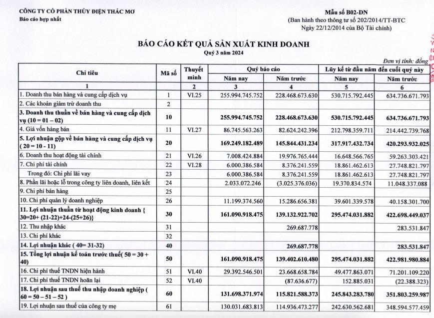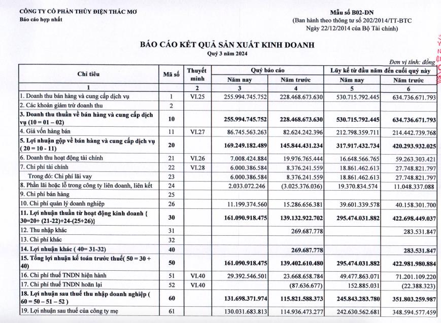Về kết quả kinh doanh, trong quý III/2024, Thủy điện Thác Mơ đạt gần 256 tỷ đồng doanh thu thuần, tăng hơn 12% so với cùng kỳ năm ngoái. Giá vốn hàng bán tăng nhẹ, qua đó lợi nhuận gộp ghi nhận tăng 16% lên mức 169,2 tỷ đồng.
