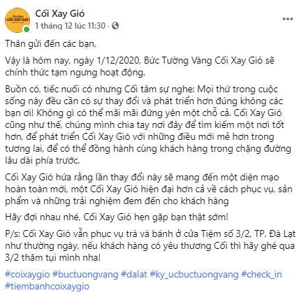 Theo fanpage chính thức của cửa tiệm, bức tường vàng đã bị xóa bỏ vào ngày 1/12 vừa qua, đồng nghĩa Cối Xay Gió cơ sở Hòa Bình đã dừng hoạt động. Tuy nhiên, tiệm bánh Cối Xay Gió vẫn còn một cơ sở khác đang hoạt động bình thường tại địa chỉ số 7A đường 3/2 Đà Lạt. Phía Cối Xay Gió cũng cho biết sẽ trở lại trong thời gian tới với nhiều thay đổi về diện mạo, phong cách phục vụ.