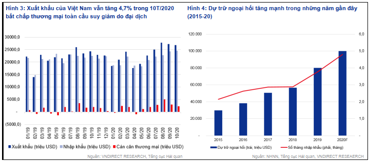 Tỷ giá được hỗ trợ mạnh bởi thặng dư thương mại và dự trữ ngoại hối liên tục gia tăng trong thời gian qua. Hiện tại, thặng dư thương mại đạt mức 18,7 tỷ USD, tăng gấp đôi so với mức 9,3 tỷ USD của cùng kỳ năm 2019. Bên cạnh đó, dự trữ ngoại hối của Việt Nam đã tăng lên mức 92 tỷ USD tính đến hết 8/2020, từ mức 80 tỷ USD hồi cuối năm 2019.