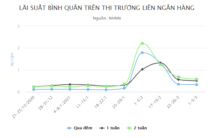 Tuy nhiên, mức thấp này dao động trong khoảng 0,3% với kỳ hạn qua đêm và 0,5% với kỳ hạn 1 tuần, cũng cao gấp 2-3 lần so với các tuần trước tháng 1/2021.
