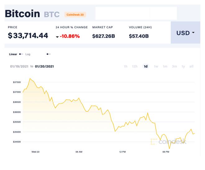 Theo Coindesk, cuối ngày 20/1, giá đồng Bitcoin tiếp tục giảm xuống dưới mức 34.000 USD/đồng. Hiện, đồng tiền mã hóa lớn nhất thế giới được giao dịch quanh ngưỡng 33.714 USD/đồng, giảm 10,86% so với một ngày trước đó.